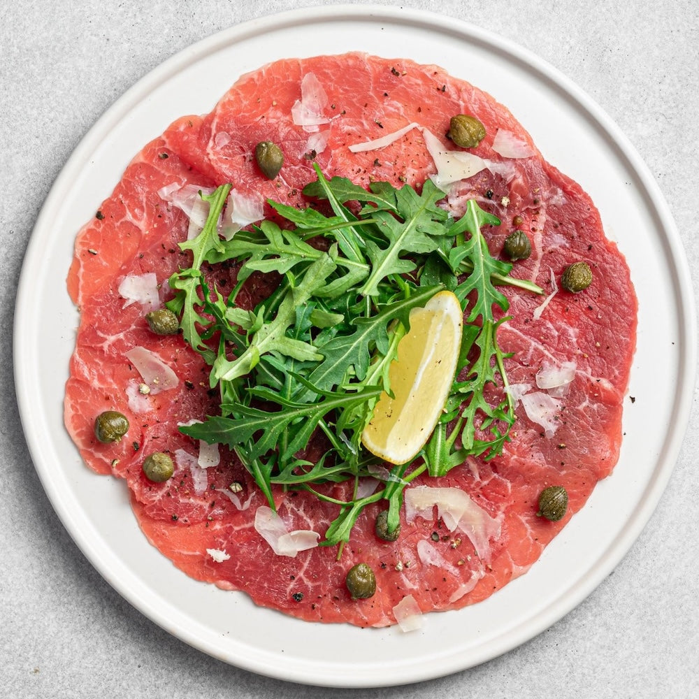 Carpaccio, in het Italiaans vertaald als 'dun gesneden'. De carpaccio is vers gesneden en direct ingevroren. Even ontdooien op het aanrecht en genieten van dit heerlijke dungesneden rundvlees. Het is al op het gewenste gewicht gesneden. Pijnboompitten, een zoetzure dressing van honing-mosterd, kleine plakjes kaas, een paar kappertjes en rucola is hetgeen wat kan worden toegevoegd om de carpaccio compleet te maken.